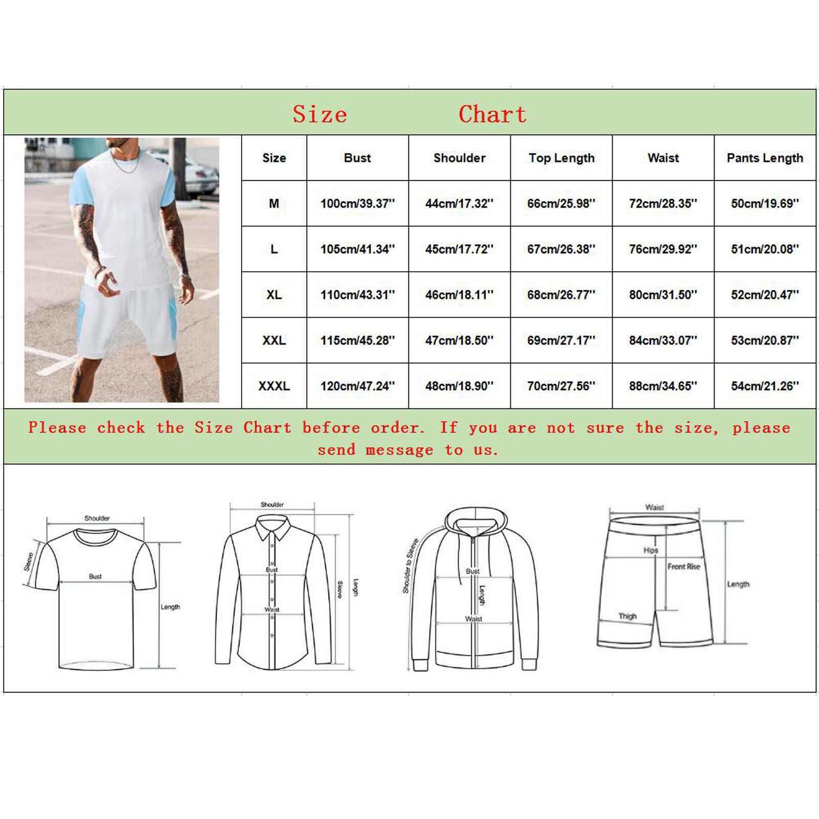 Размеры Бюст Плечо Длина верха Талия Длина брюк М 100 см/39,37'' 44 см/17,32'' 66 см/25,98'' 72 см/28,35'' 50 см/19,69'' L 105 см/41,34'' 45 см/17,72'' 67 см/26,38'' 76 см/29,92'' 51 см/20,08'' XL 110 см/43,31'' 46 см/18,11'' 68 см/26,77'' 80 см/31,50'' 52 см/20,47'' XXL 115 см/45,28'' 47 см/18,50'' 69 см/27,17'' 84 см/33,07'' 53 см/20,87'' XХХL 120 см/47,24'' 48 см/18,90'' 70 см/27,56'' 88 см/34,65'' 54 см/21,26''