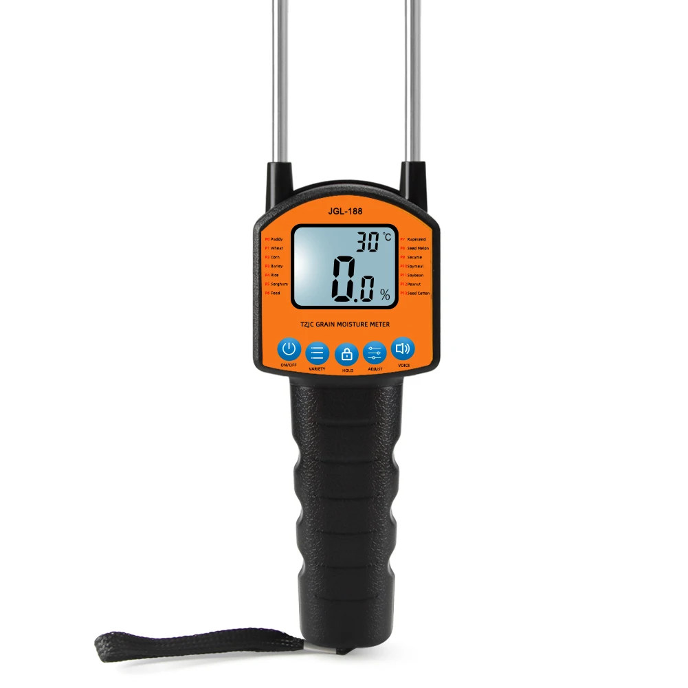Цифровой ЖК-дисплей с большой подсветкой, 0.1% высокая точность, Высокочувствительный зонд, точное измерение. -25 °C-50 °C Диапазон измерения температуры. Английская Голосовая передача, легко носить с собой. Диапазон измерения влажности составляет 14 разновидностей: рис, пшеница, кукуруза, ячмень, рис, сорго, корм, семена рапса и дыни, кунжут, соевая мука, сои, арахис, хлопок и т. Д.