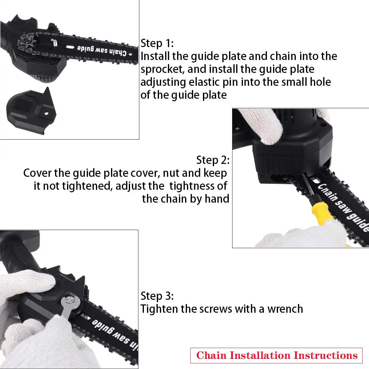 Установите направляющую пластину и цепь в звездочку и установите направляющую пластину, регулирующую эластичный штифт в маленькое отверстие направляющей пластины