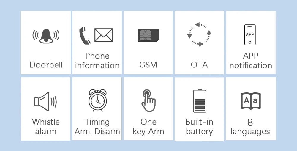После запуска аксессуара, хост может отображать статус будильника и сигнал тревоги на месте в режиме реального времени и нажать статус хоста в приложение на мобильном телефоне пользователя в режиме реального времени через встроенный WiFi. Он также поддерживает вызов номера сигнализации и отправку сообщения на указанный номер телефона через встроенный модуль GSM.