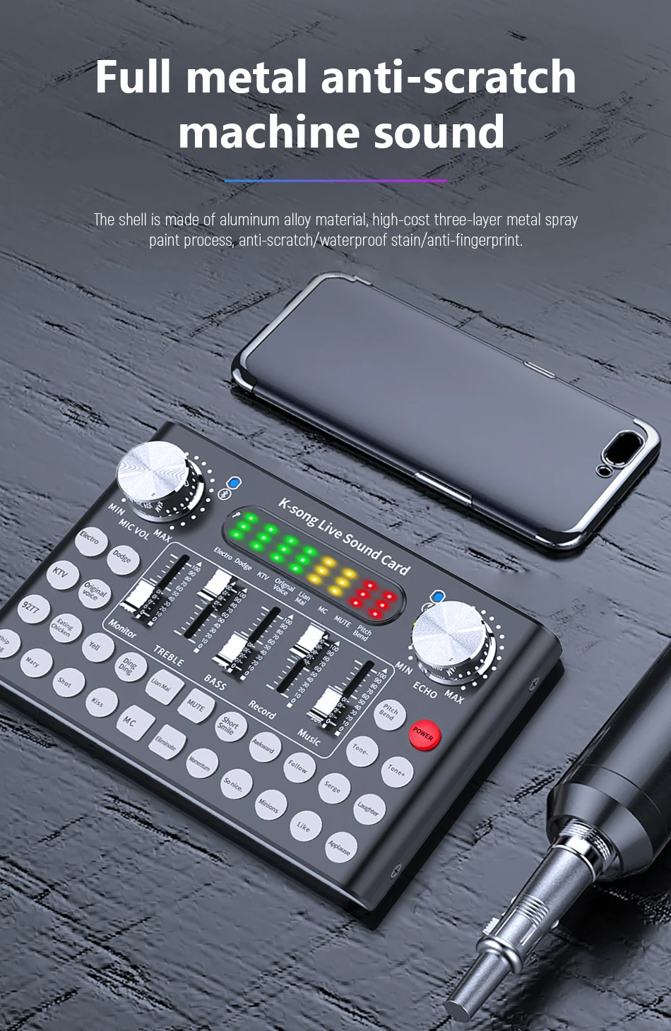 Вы можете подключить телефон через BT, чтобы избежать проблем с проводным подключением.-полная совместимость. Мобильный звуковой Миксер с живой звуковой картой совместим с большинством основных программ Kara song, мобильными телефонами IOS и Android, планшетами, компьютером, наушниками, динамиками, микрофоном, простыми в использовании. -Возможность изменения звука в режиме реального времени с интеллектуальным шумоподавлением. -Голос телефона забавен для совершения шуток, с 18 спецэффектами-функция сопровождения Bluetooth, корпус из алюминиевого сплава, защита, изменение звука, возврат ушей в реальном времени.
