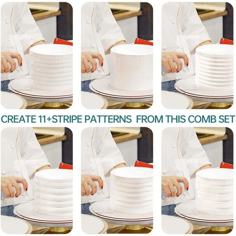 Этот набор для края торта обеспечивает шесть различных форм для края торта, включая гладкие и полосатые края, так что вы можете сделать вкусные пирожные с различными формами, обе стороны этого скребка для торта доступны для использования.