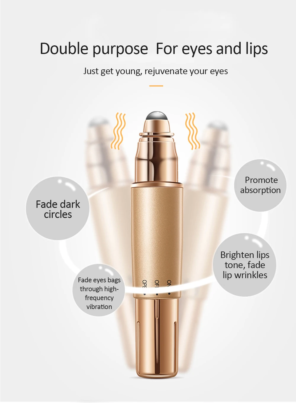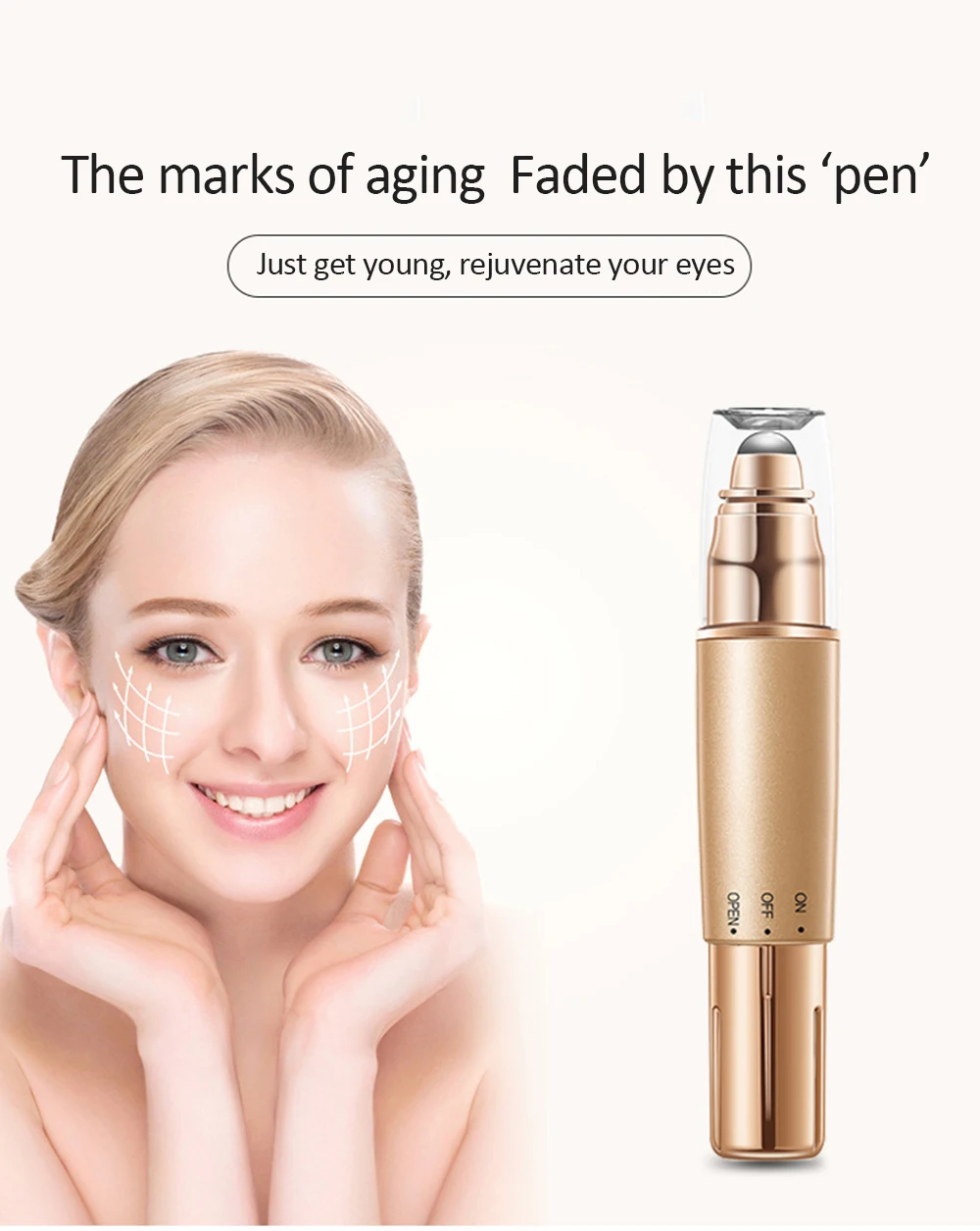 -One-click beauty device, soothes skin problems-Deep massage-Lifting and firming-Massage the area in circular motions to tighten the skin-Do facial lifting exercises in the area shown