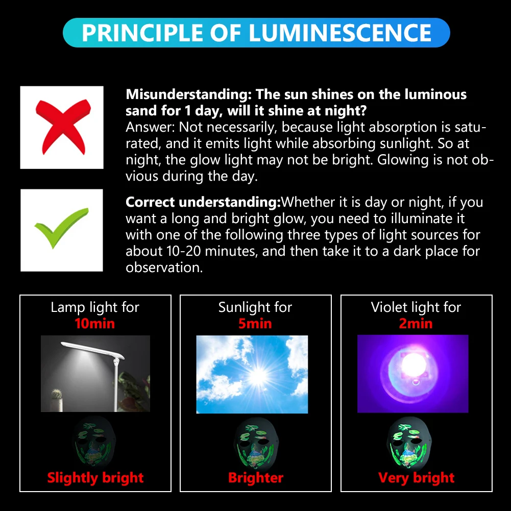 3. После получения товара, пожалуйста, "зарядите" светящийся sИПод светильник или солнечный светильник.Песок светится, когда он поглощает светильник. Вам нужно «зарядить» его дольше с помощью яркой лампы или солнечного света, если вы хотите, чтобы увидеть длинное и яркое светится в темноте.