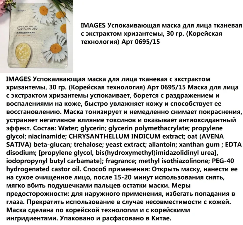 Применение: приложить к очищенной коже лица и оставить на 15-20 мин. Не