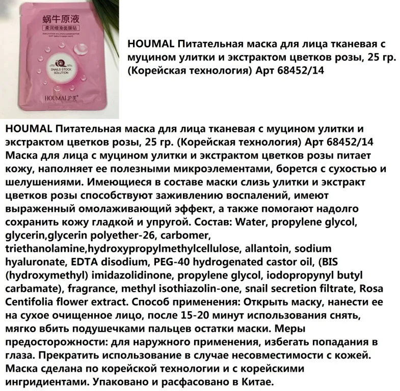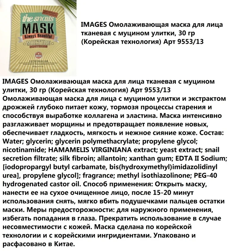 Действие: маска содержит богатые ингредиенты гиалуроната натрия и олигопептидов, устраняет тусклость и дряблость, улучшает внешний вид и состояние кожи. Великолепно питает и увлажняет, способствует удержанию влаги в эпидермисе. Повышает тургор кожи, делает ее мягкой и разглаживает рельеф. Обеспечивает интенсивный увлажняющий уход за сухой кожей. Для любого типа кожи.