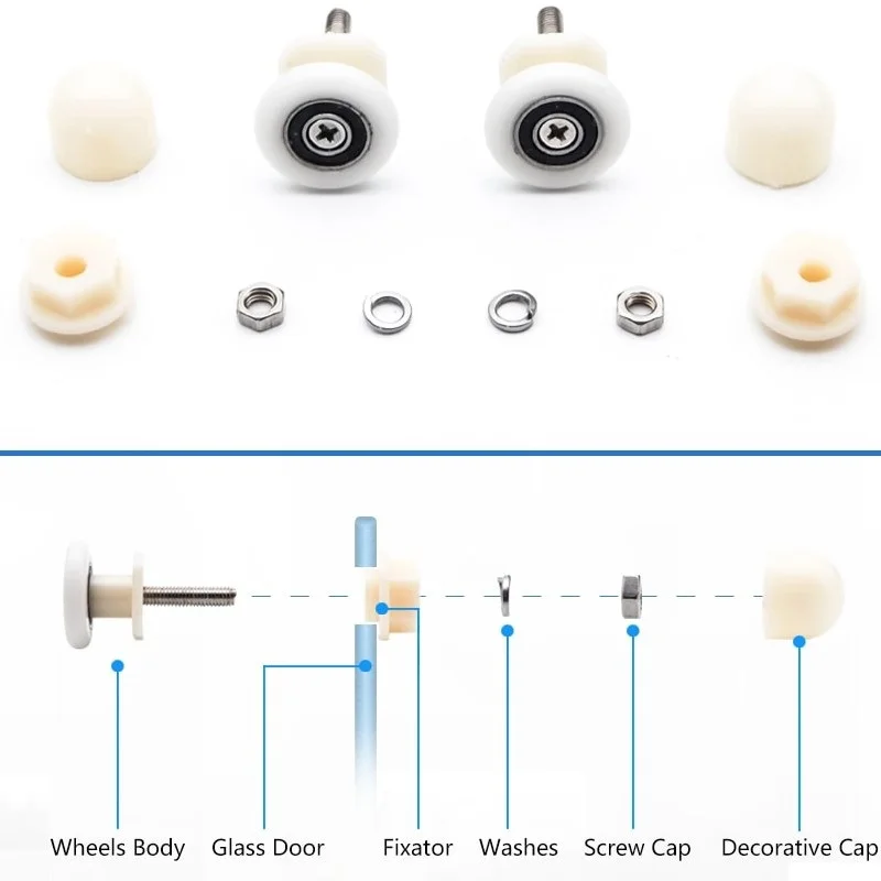 Комплект. Ролики для душевых дверей кабин (8 шт) одинарный с экцентриком диаметром 27 мм. Отверстие в стекле: d-11-12 мм.