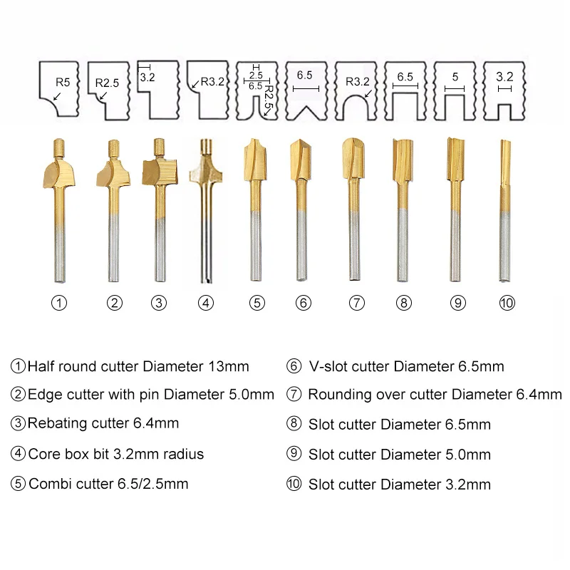 Десять резцов различных форм и размеров, обычно используются на электрических триммеров для отделки дерева, фрезерования и другой обработки.