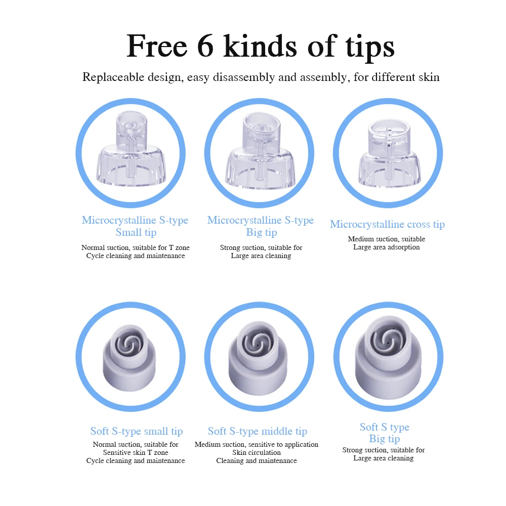 5 сменных всасывающих головок для различных потребностей кожи: Обеспечить 5 профессиональных всасывающих головок для различных условий кожи. Выбор разных размеров для разных лицевых поверхностей. Чтобы быть вашим профессиональным домашним спа-средством по уходу за кожей.