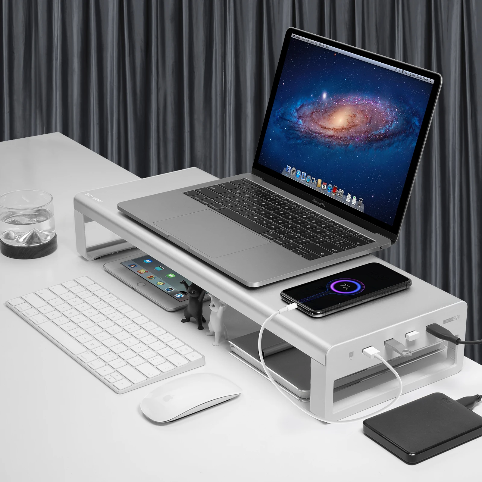 Алюминиевая Подставка для монитора металлический стояк с USB 3.0 поддержка передачи данных и зарядки, органайзер для хранения клавиатуры и мыши