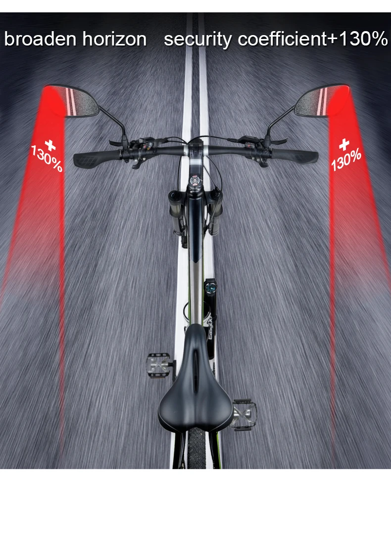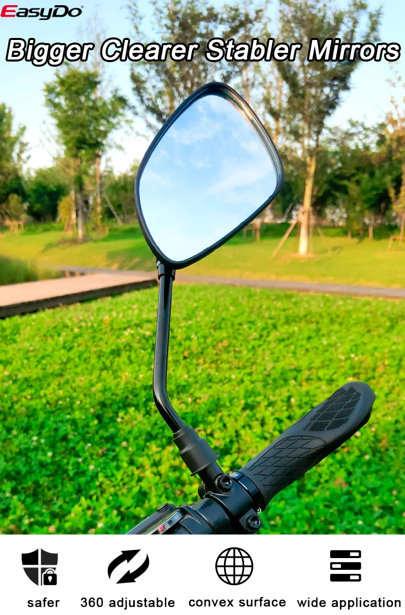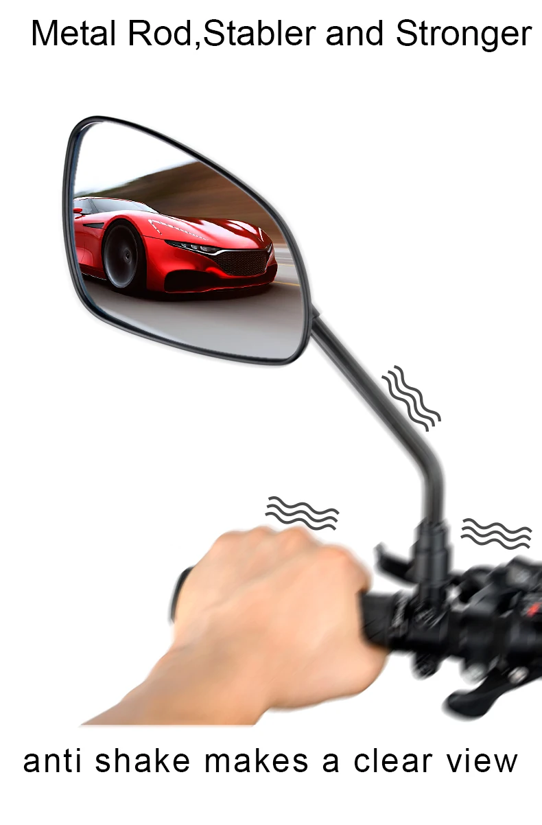 1. Металлический зеркальный корпус: более прочный и антиударный. 2. Размер: удлиненный и расширенный: предотвращает блокировку зеркала. 3. Выпуклое зеркало: обеспечивает четкое и расширенное представление. 4. Установка: подходит для 95% велосипедов/электровелосипедов/скутеров на рынке. Диаметр ручки 22-25 мм может быть установлен.