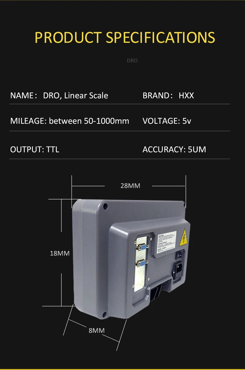 The order includes one piece 3-axis dro with 3pcs linear scales, travel length between 50-1000mm, Accuracy are 5um