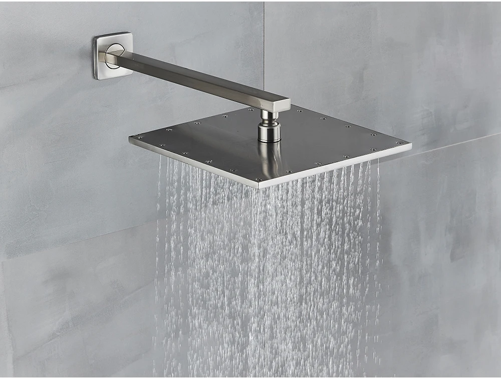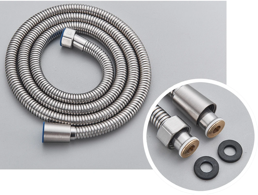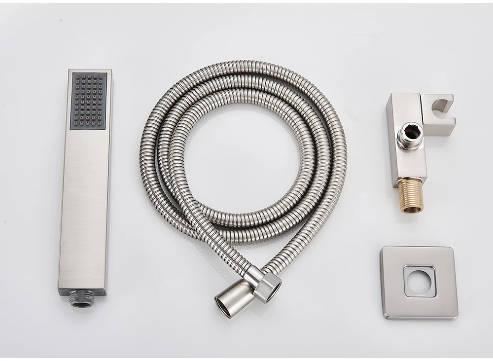 -Насадка для душа от дождя (латунь) -Ручная душевая головка (пластик) -Душевая кабина (латунь) -Шланг для душа 59 дюймов (нержавеющая сталь 304) -Держатель для душа (пластик) -Клапан управления душевой смеситель (латунь) -Аксессуары для душа