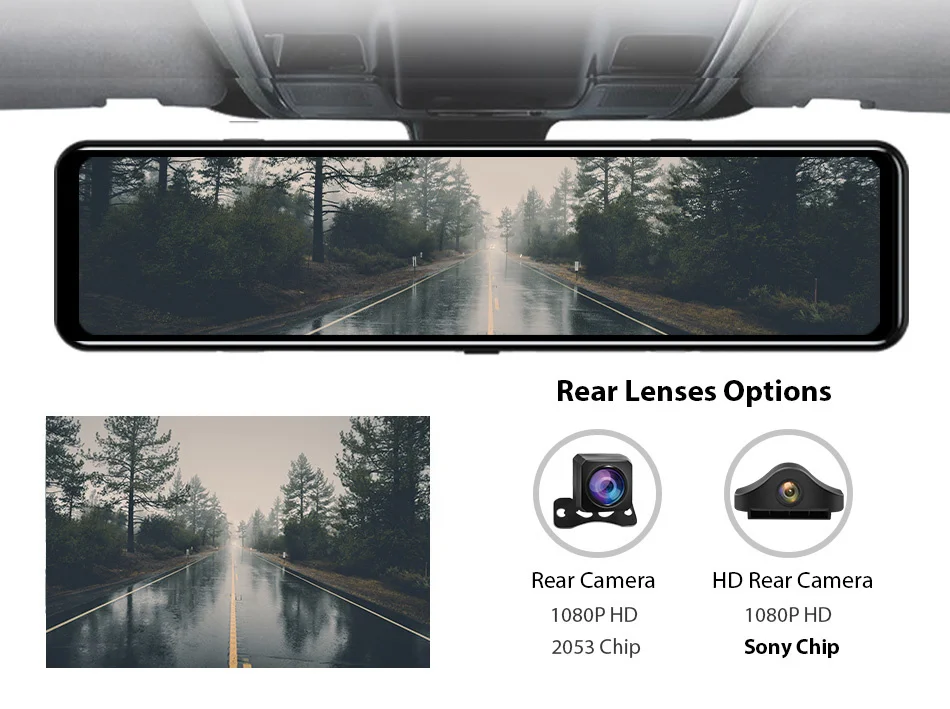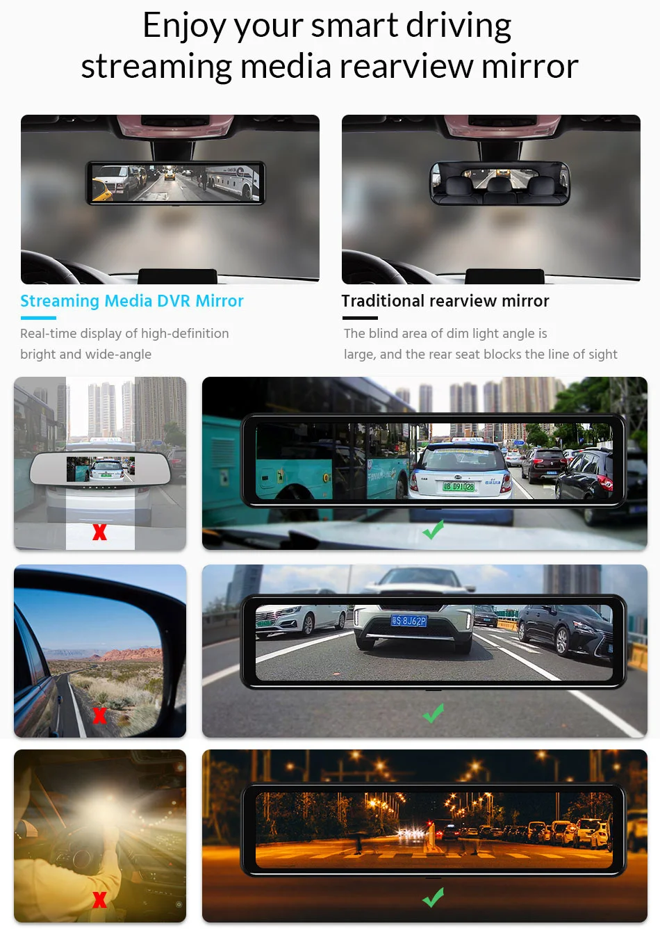 Он оснащен этой технологией потоковой передачи данных, делает угол заднего вида вождения более широким, это тройной широкий угол обзора, а затем традиционное зеркало. Видеорегистратор использует HD, чтобы предоставить вам безупречные изображения в дождь, туман, снег, или даже при слабом освещении.