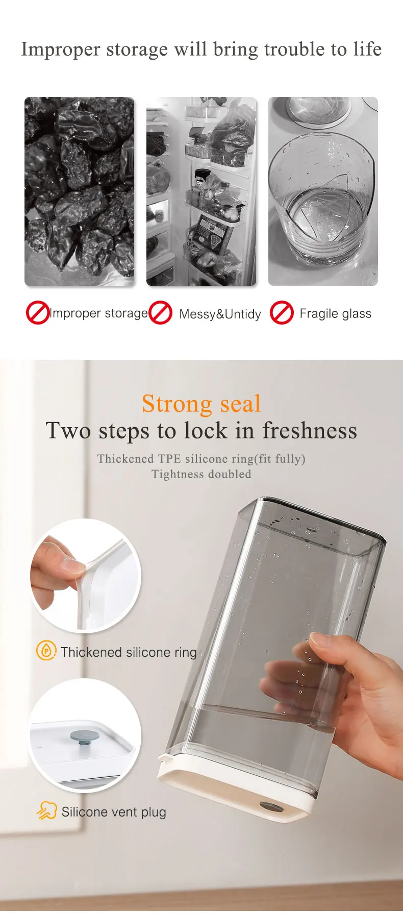 [Multifunctional choice]-Square storage container is equipped with a silicone sealing strip and silicone vent plug to ensure that water and air cannot enter, so as to better ensure the freshness of the food in the grain storage container.
