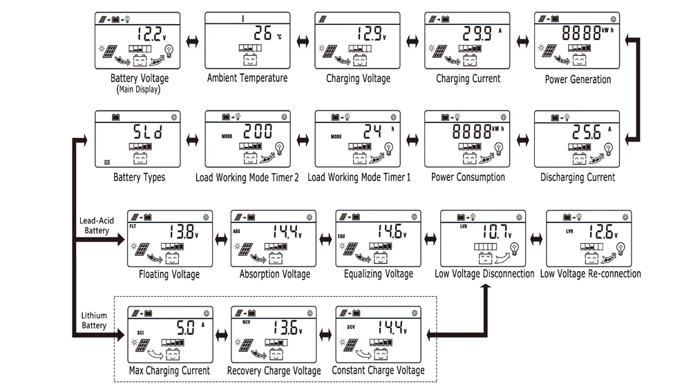 Поддержка большего количества видов батарей: свинцово-кислотная батарея (герметичная, гелевая, затопленная) и литиевая батарея (LiCoMnNiO2, LiFePO4);