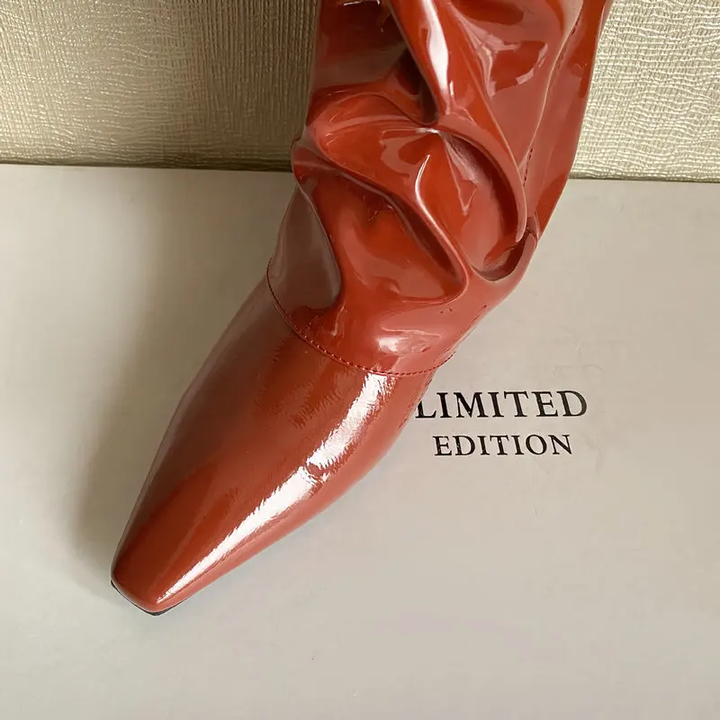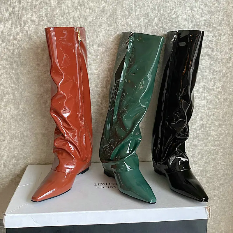Зеркальные сапоги до колена из лакированной кожи на танкетке; Модные удобные женские сапоги на высоком каблуке 6 см