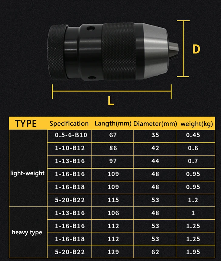 Диапазон зажима: 0,5-6 мм, 1-10 мм, 1-13 мм, 1-16 мм, 5-20 мм