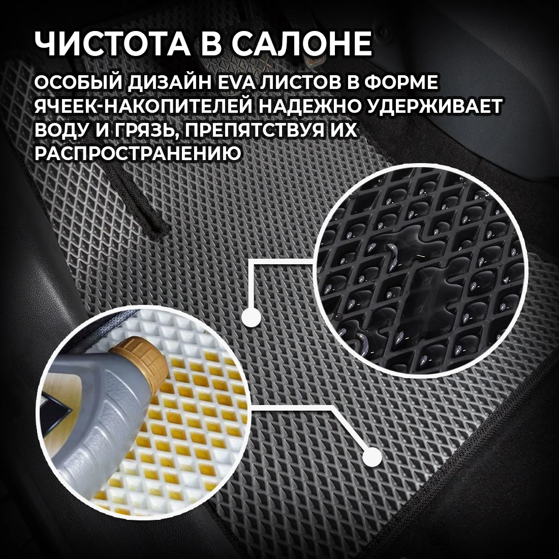 Прогрессивный дизайн EVA основы ковриков в форме ячеек-накопителей не дает воде и грязи растекаться, тем самым минимизируя контакт с вашей обувью и одеждой, а также не давая им распространяться по салону автомобиля.