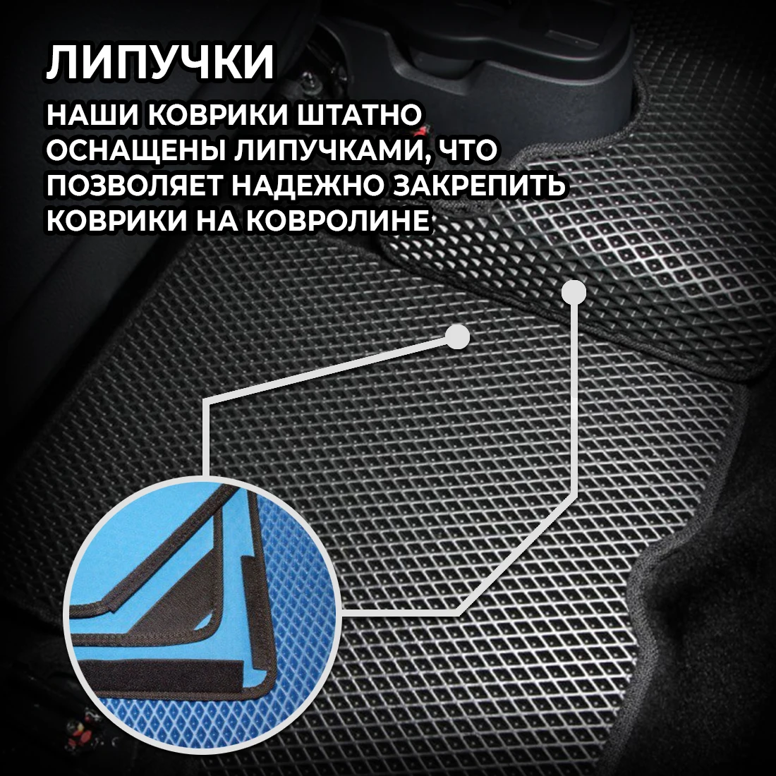Крепления позволяют жестко зафиксировать коврики в салоне для безопасного вождения: