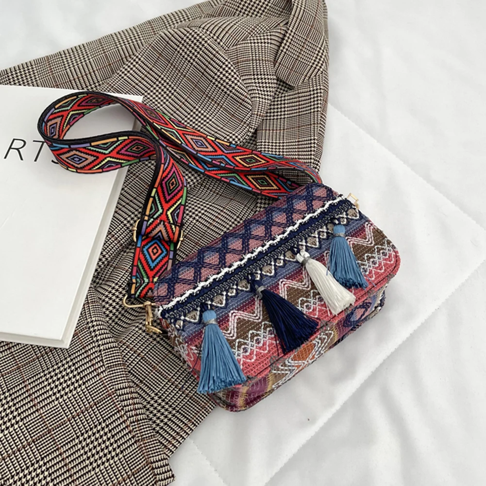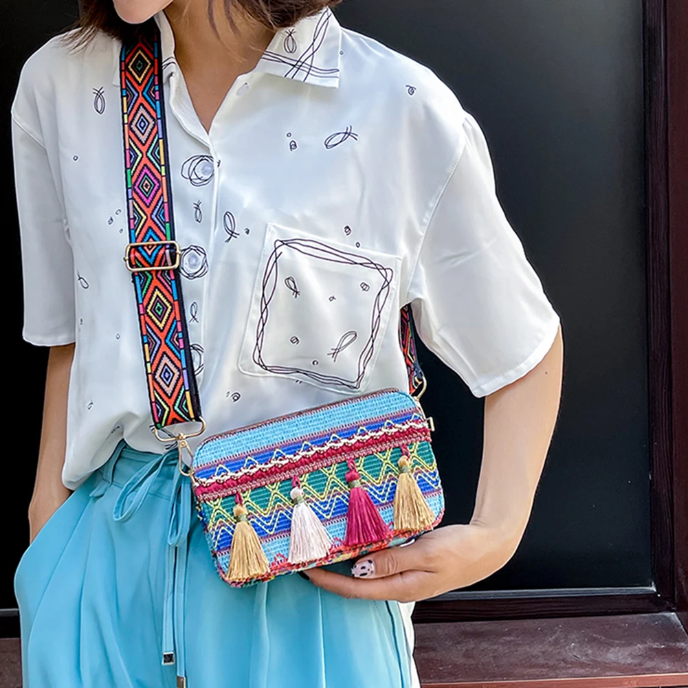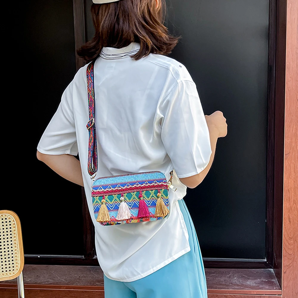 2021 Летняя женская сумка через плечо из искусственной кожи в этническом стиле, сумка через плечо с широким поясом, сумка через плечо с полосками и кисточками, женская маленькая квадратная сумка