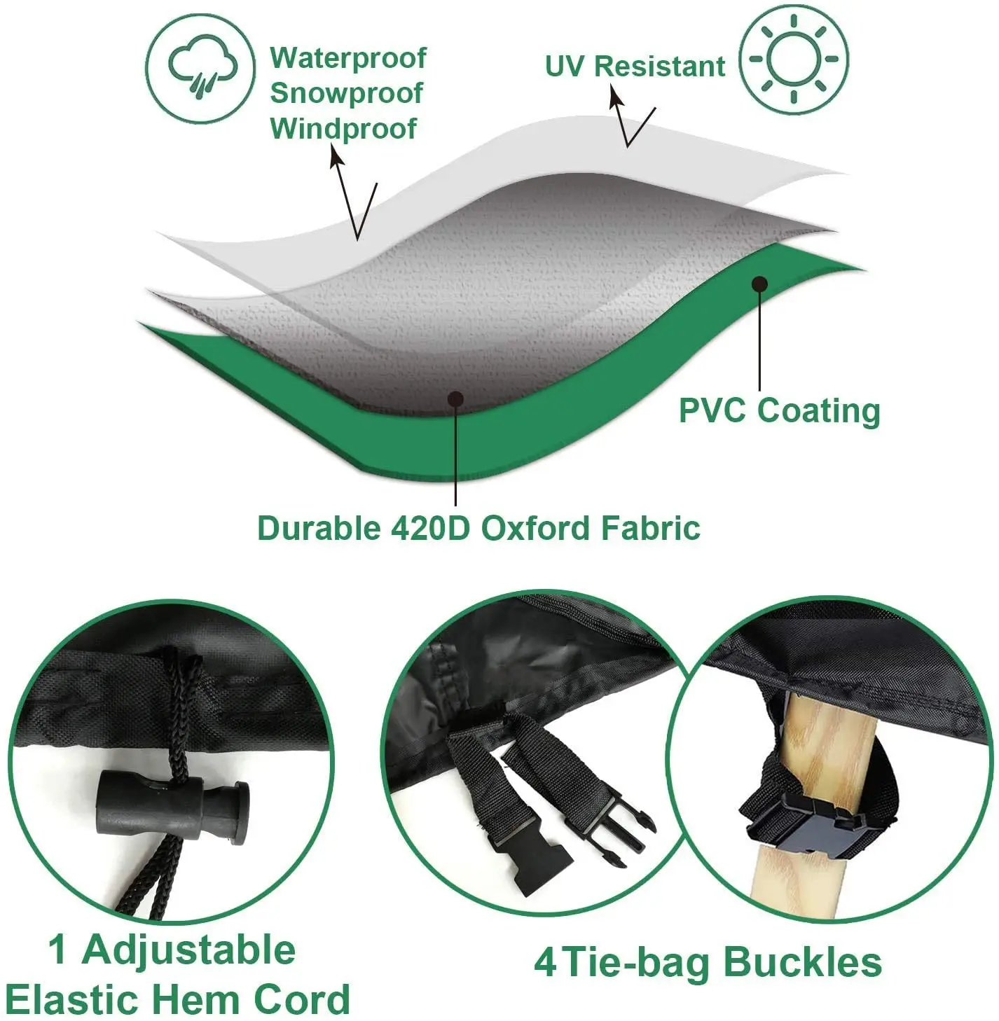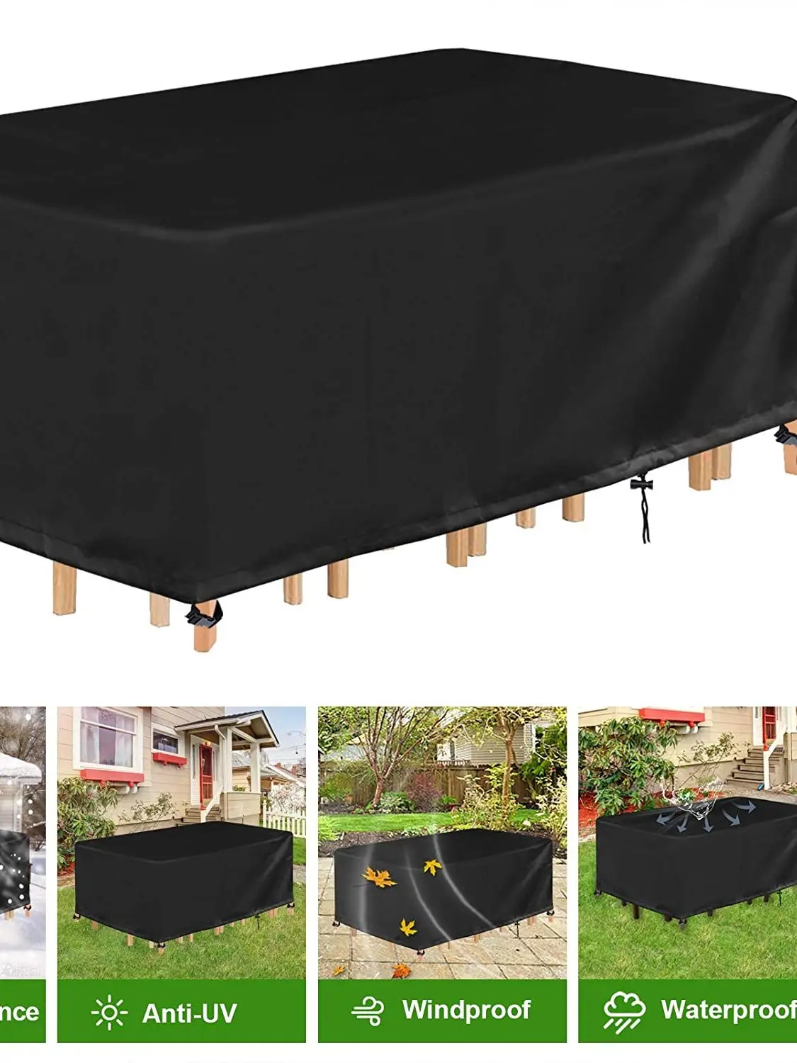 -Экстра-толстый материал крышки-160 г/мм2 2; Вместо нормального 120 г/м МПа 2;.-Водонепроницаемость составляет до 10000 па, что очень подходит для размещения столов и стульев за пределами сиденья.-Чехол для садовой мебели имеет регулируемый шнурок и ремень с пряжкой для обеспечения прочной фиксации.-Поставляется с красивым чемоданом для удобного хранения.-Универсально применимый, Подходит для садовой мебели, садовых стульев, садовых столов, сидений, пляжных стульев, консольных зонтов, зонтов, мебели для патио, сидений, комплектов мебели и т. д.
