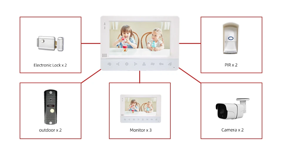Монитор поддерживает подключение аналоговых камер, электронных замков и PIR сигналов тревоги. Может защитить вашу семью и безопасность собственности во всех направлениях.
