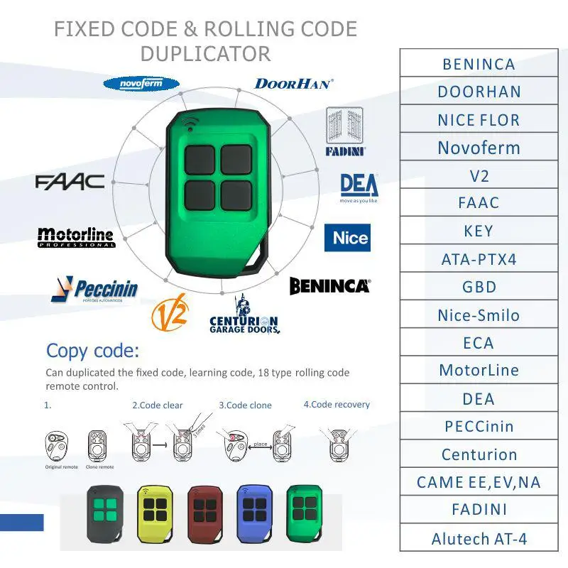 Для бренда Rolling code: Пожалуйста, убедитесь, что ваш оригинальный пульт дистанционного управления был точно таким же, как наш следующий список.