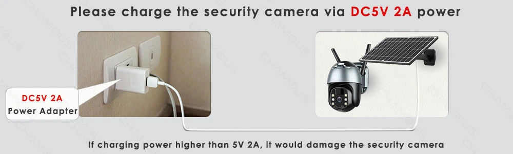 Используйте адаптер DC5V 2A для зарядки камеры видеонаблюдения