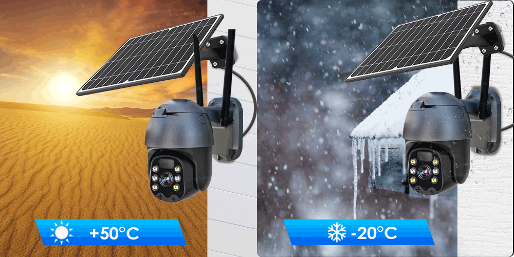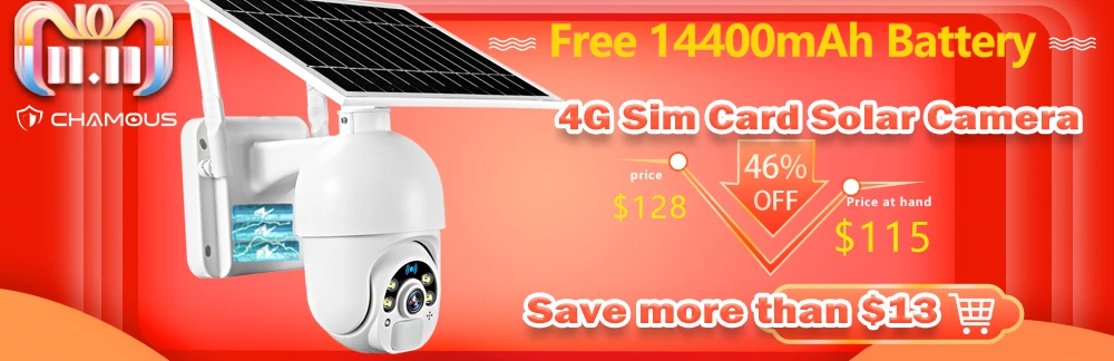 * Камерная Солнечная камера полностью заряжена солнечной панелью 8 Вт, которая обеспечивает 100% безпроводную защиту.