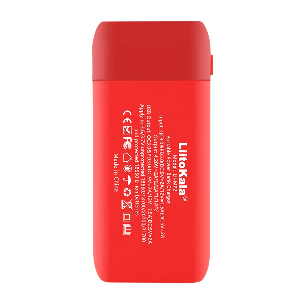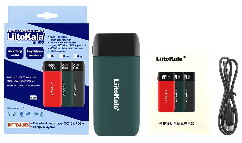 Вставьте две или одну литий-ионную батарею (максимальная емкость до 10 Ач), при подключении внешнего устройства (мобильный телефон и т. д.) зарядное устройство автоматически зарядит внешнее устройство. Выход совместим с различными протоколами быстрой зарядки. Когда внешнее устройство не поддерживает быструю зарядку, выход по умолчанию составляет 5V2A. Когда внешнее устройство поддерживает протоколы быстрой зарядки, выход будет зависеть от напряжения и тока, запрашиваемого внешним устройством, а максимальная мощность-18 Вт.