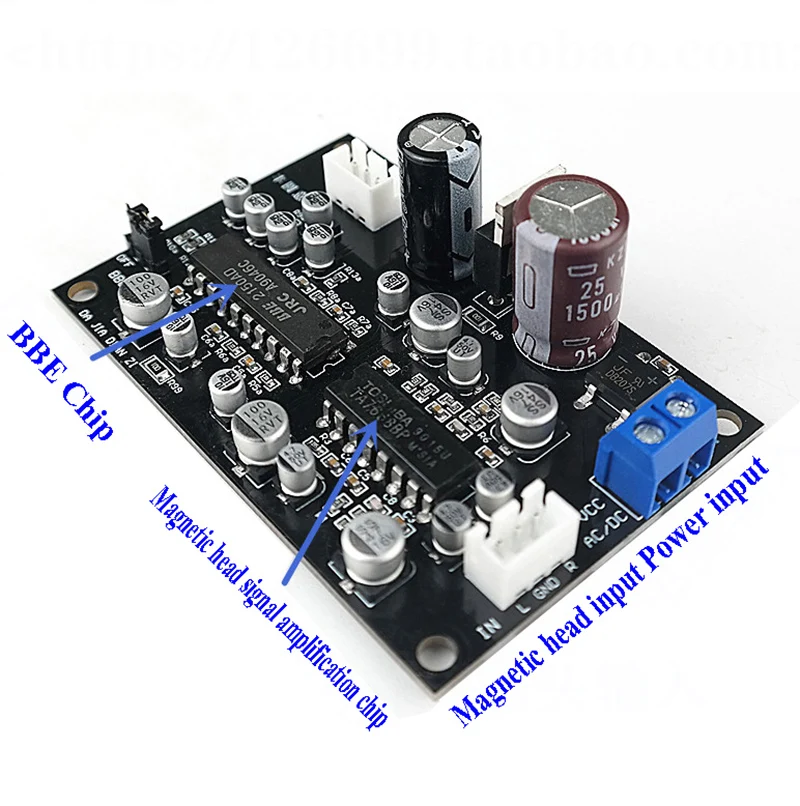 Он принимает специальный чип предварительного усилителя TA7668 (используется) для магнитной головки, который предназначен для усиления магнитной головки старой колоды ленточного привода, с чипом обработки звука JRC2150BBE, который эффективно усиливает высокие и низкие звуки и улучшает четкость звука. Источник питания имеет цепь выпрямителя, которая может быть входом переменного тока или входом постоянного тока.