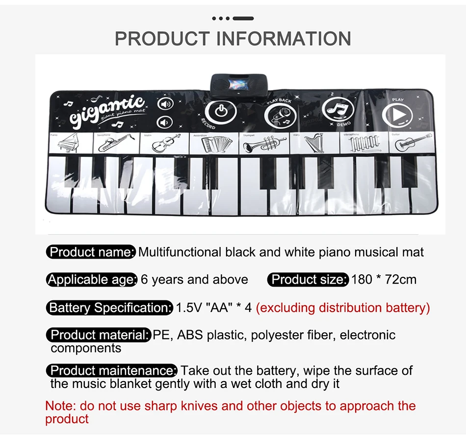 Этот музыкальный ковер имеет милый мультяшный рисунок и яркий цвет, привлекая внимание ребенка.
