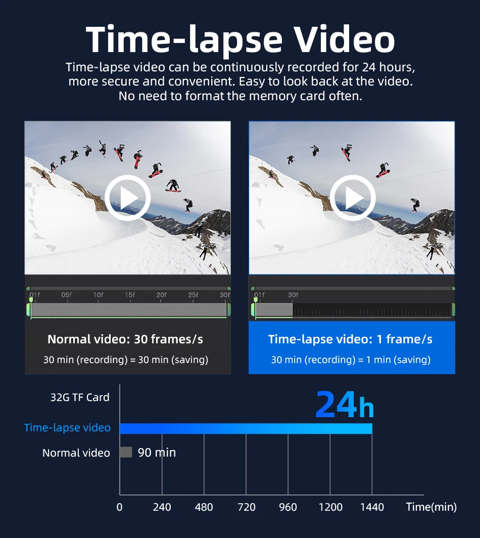 Видео с таймеромВидео с таймером можно непрерывно записывать в течение 48 часов, более безопасно и удобноЛегко посмотреть на видео.Не нужно часто Форматировать карту памяти.(Примечание: нужно купить блок питания DVR)