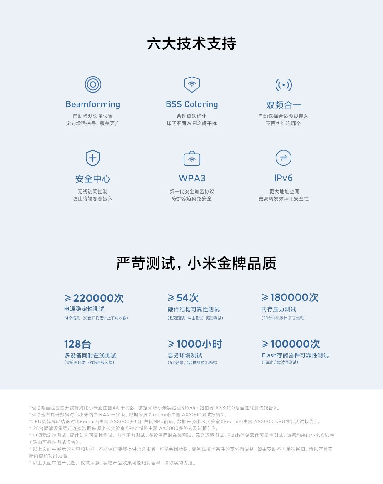 IEEE 802.11a/b/g/n/ac/ax, IEEE 802,3/3u/3abСтандарты сертификации:ГБ/T9254-2008; GB4943.1 -2011Беспроводной канал:2,4 ГГц канал: 1,2,3,4,5,6,7,8,9,10,11,12,135 ГГц канал: 36,40,44,48,52,56,60,64, 149153157161165Режим модуляции:11b: DSSS: DBPSK(1 Мбит/с), DQPSK (2 Мбит/с), CCK (5,5/11 Мбит/с)11a/g: OFDM: BPSK Нью-Йорк (6/9 Мбит/с), QPSK (12/18 Мбит/с), 16QAM Нью-Йорк (24/36 Мбит/с), 64QAM(48/54 Мбит/с)11n: MIMO-OFDM: BPSK, QPSK, 16QAM, 64QAM. Набор ставок: MCS0 ~ MCS1511ac: MIMO-OFDM: BPSK, QPSK, 16QAM, 64QAM, 256QAM.Набор скоростей: MCS0 ~ MCS9 (поддерживается 2 потока)11ax: MIMI-OFDM: BPSK, QPSK, 16QAM, 64QAM, 256QAM, 1024QAM. Набор скоростей: MCS0 ~ MCS11 (поддерживается 2 потока)Упаковочный лист:Роутер Redmi AX3000 × 1, руководство × 1, вилка CN/US × 1.