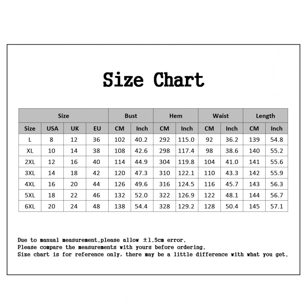 [Наш Размер 5XL] Обхват груди: 132 см/52 дюйма, Подол: 322 см/126,8 дюйма, обхват талии: 122 см/48 дюймов, длина: 144 см/56,7 дюйма (прибл.)