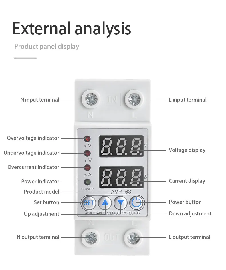 Продукт серии AVP-63 интегрирует защиту от перенапряжения, защиту от перенапряжения, защиту от перегрузки по току и интегрированное интеллектуальное защитное устройство. При превышении напряжения, низкого напряжения и перегрузки по току Твердые барьеры в линии, этот продукт может мгновенно отрезать цепь, избегая ненужного повреждения электрического оборудования.
