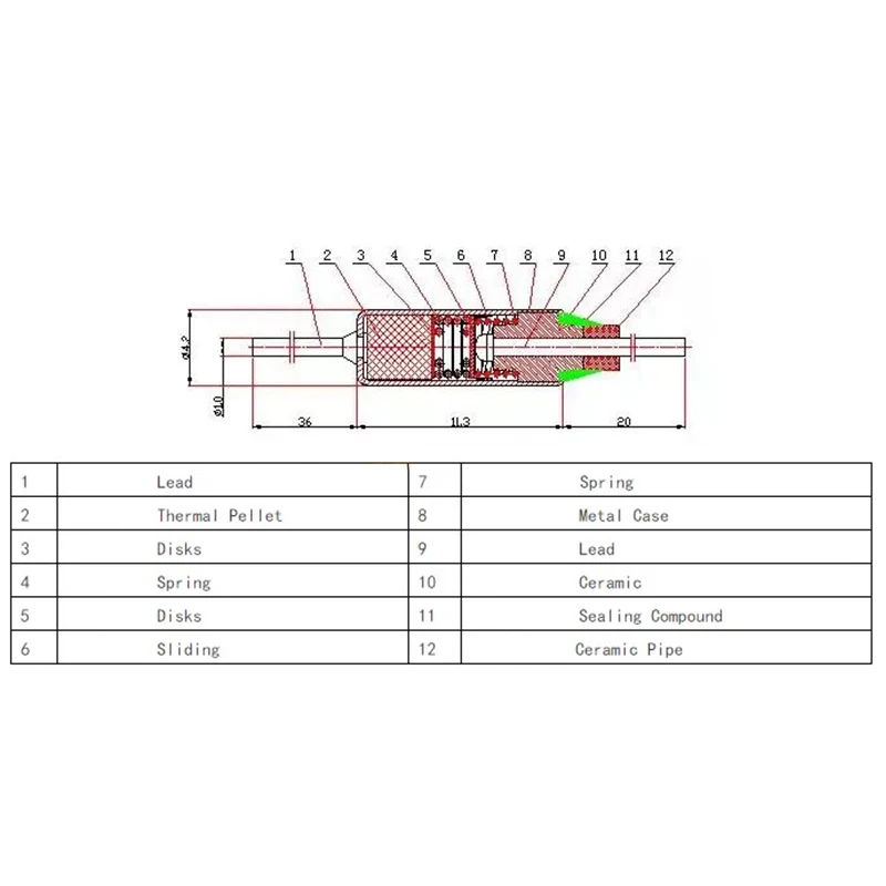 Перед действием: при нормальной рабочей температуре ток ведет от одного конца через металлическую оболочку и контактное устройство к свинцовому проводу (Контактная линия) на другом конце, чтобы сделать цепь разблокированной (и наоборот)