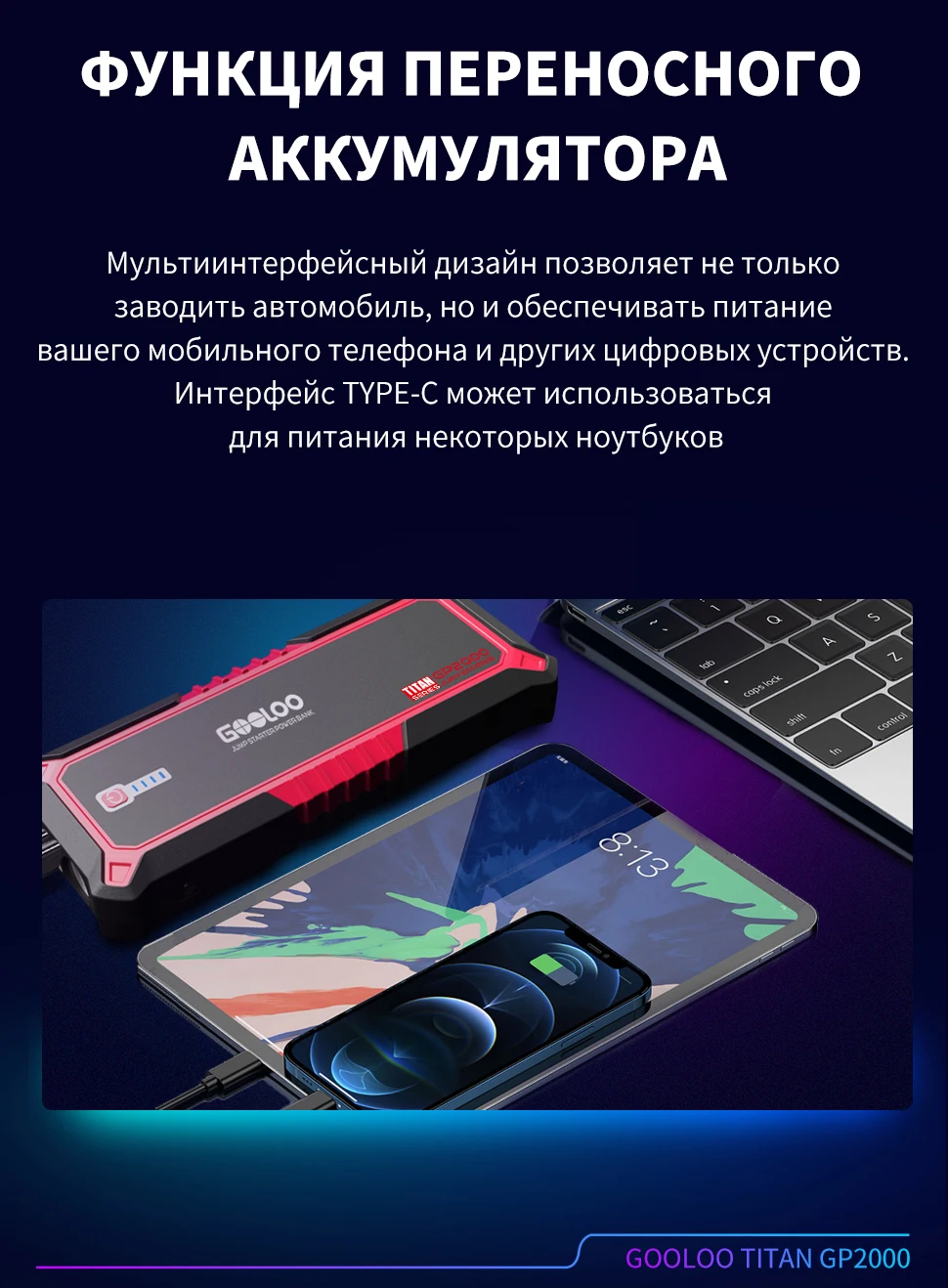 Оснащен кабелем USB для TYPE-C, вы можете быстро зарядить стартер и мобильный телефон одновременно.