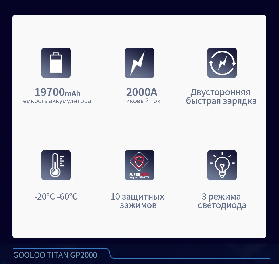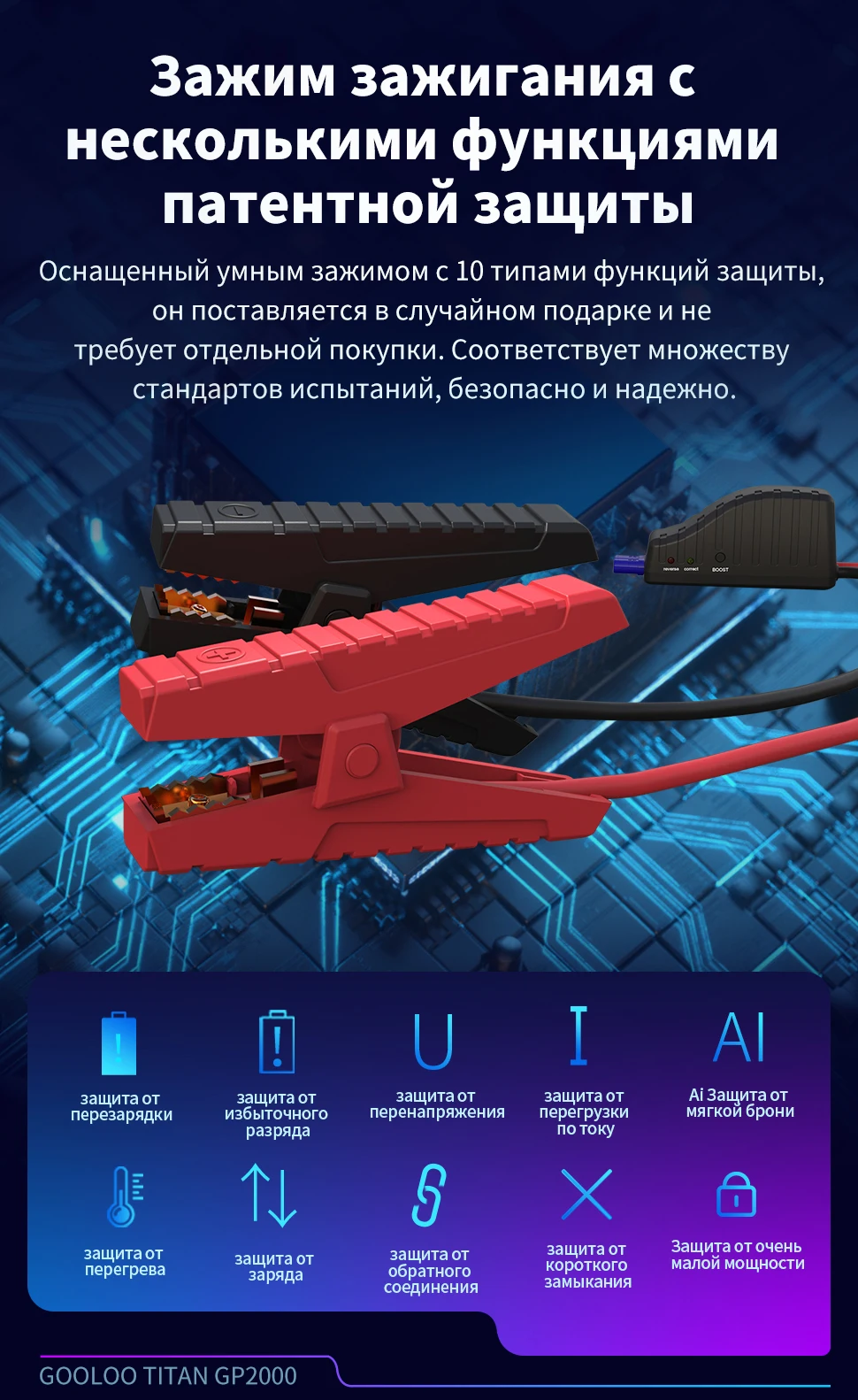 Подключение к зажиму аккумулятора может быть автоматически распознано, что позволяет избежать неправильной работы. Изолированная ручка утолщена и удлинена для удобства эксплуатации; Высокопрочный и утолщенный медный зажим устойчив к высоким температурам, сильному холоду и долгой жизни.