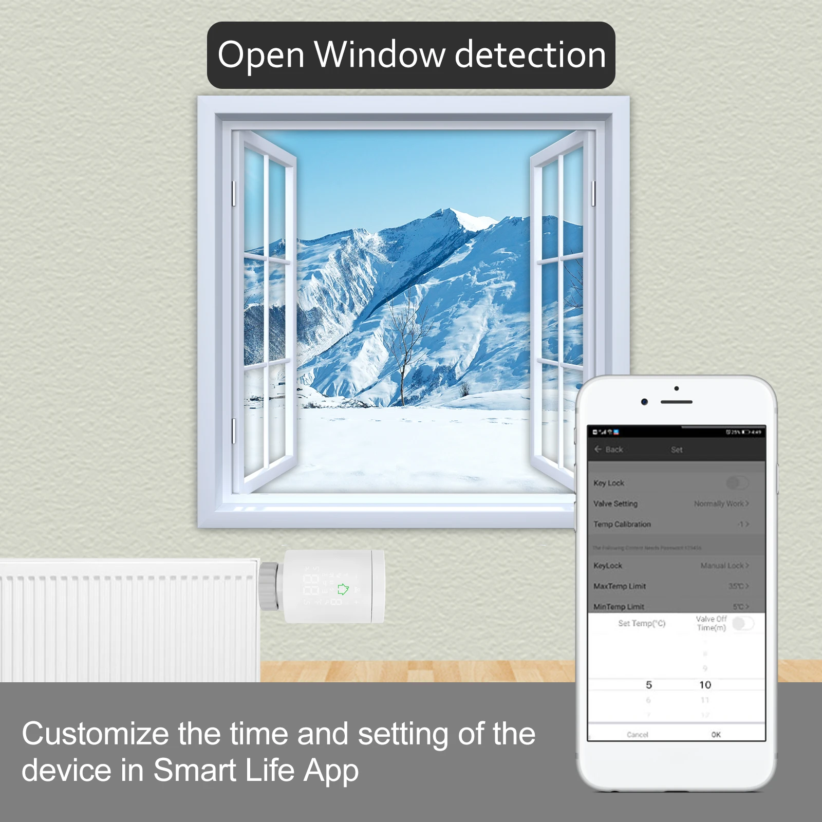 Обнаружение открытого окна: когда температура в помещении неожиданно падает в темп. Порог, клапан закроется в течение 15 минут. После этого, если температура в комнате. Все еще ниже, чем температура. Порог, он сохранит этот режим. Кроме того, легко читать цифровой дисплей с температурой Цельсия.