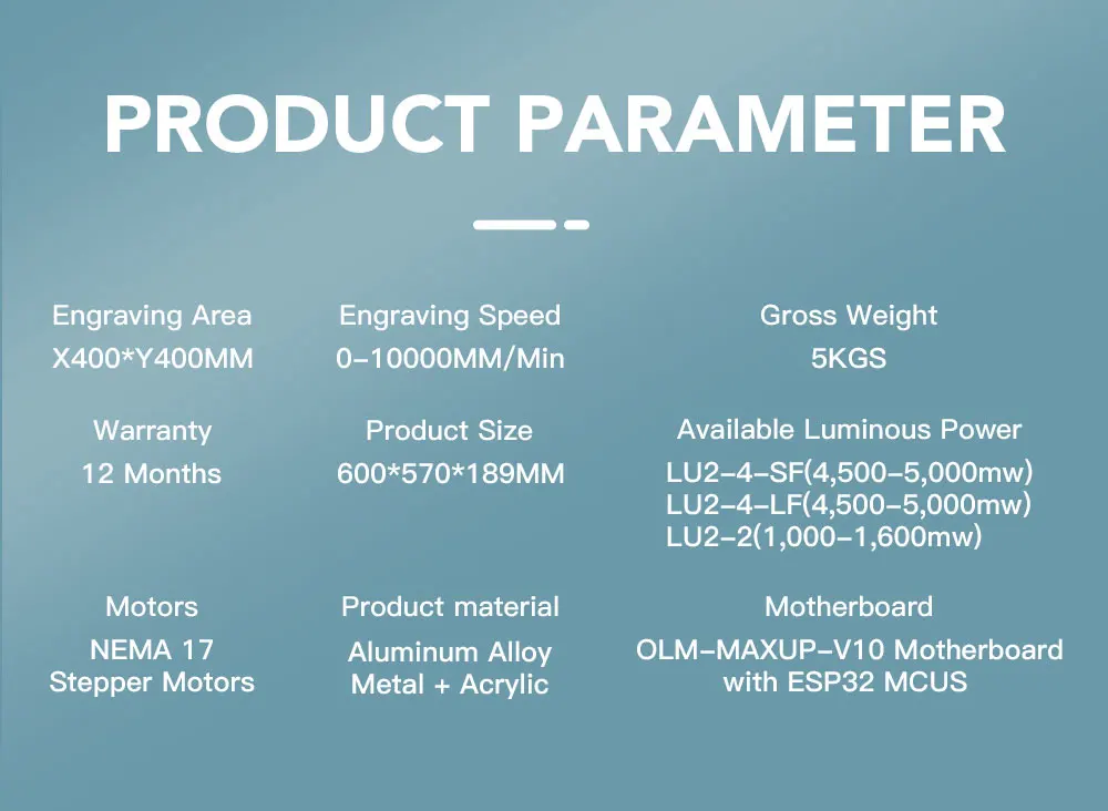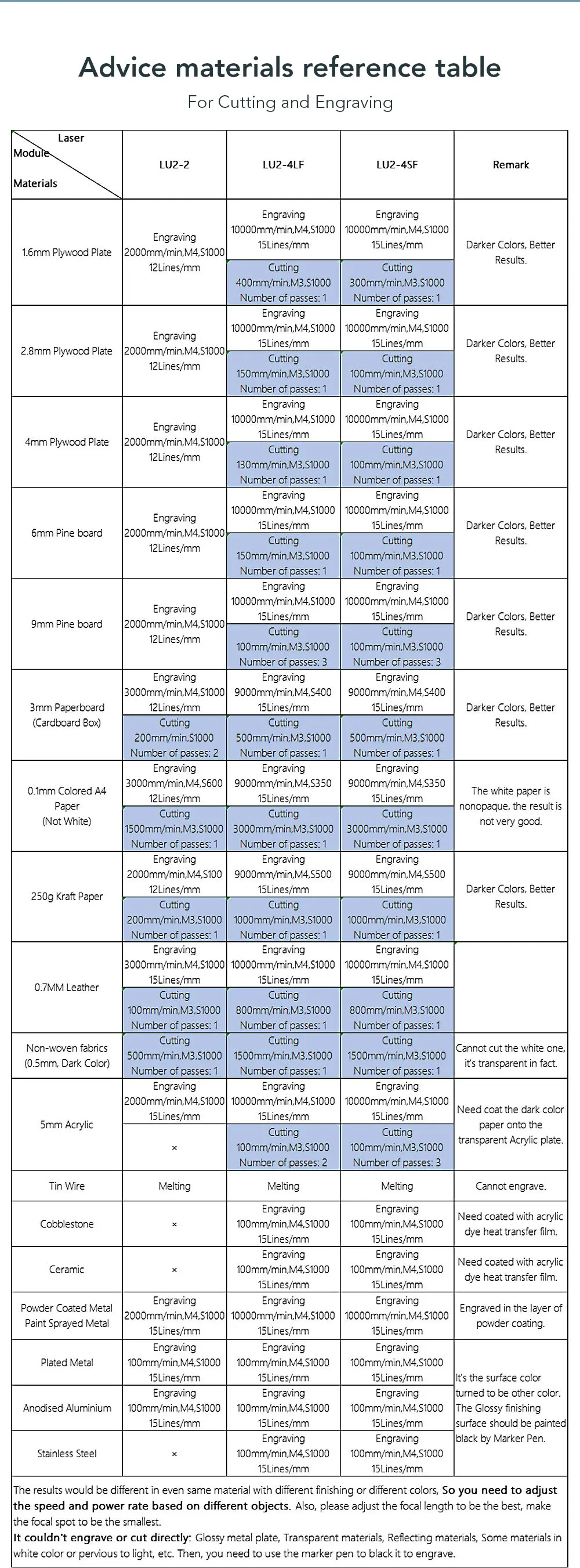 Мощность лазера: LU2-4 лазерный модуль с сжатым фокусным расстоянием 20 Вт (электрическая мощность: 20 Вт, Сила света: 5000-5500 МВт)