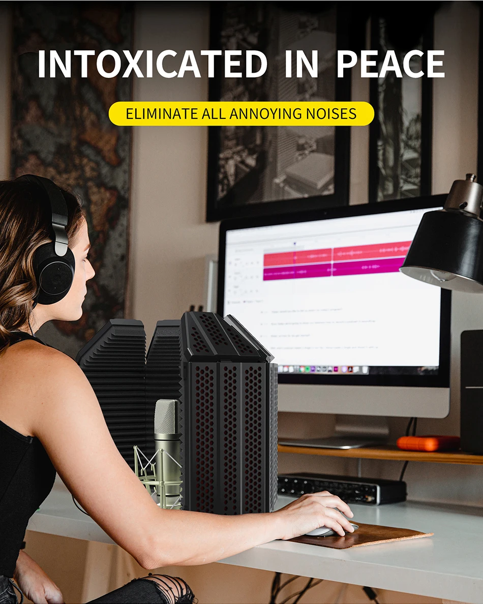 ✅Гибкость и удобство-есть много гибкость работая с микрофоном изоляции щит со стойкой, как вы можете использовать 3-панель дизайн с 2 складные боковые части, 5-панельная дизайн с 4 складные боковые части. Легко отрегулировать дизайн арки, позволяет регулировать угол для оптимальной звукоизоляции и отвечает требованиям записи окружающей среды, поэтому обеспечивает только записи самого высокого качества.