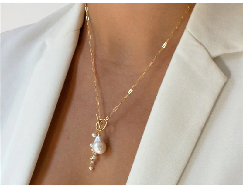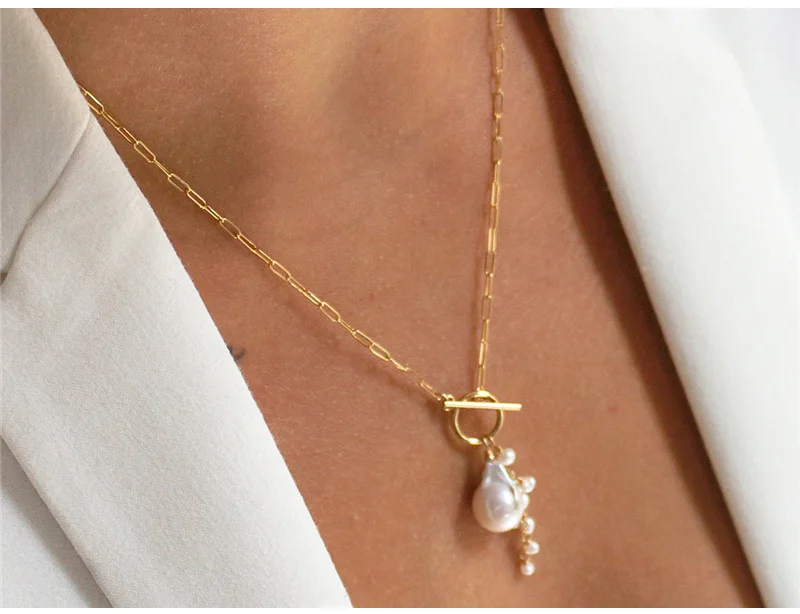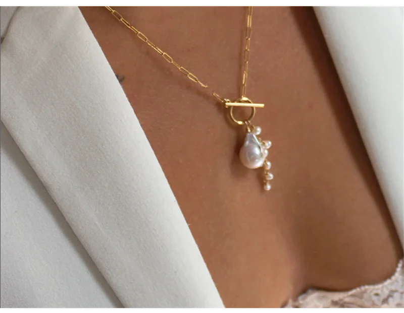 • Изящная цепочка в виде бумажного зажима с застежкой спереди, украшенная одним жемчугом в стиле барокко и подписью