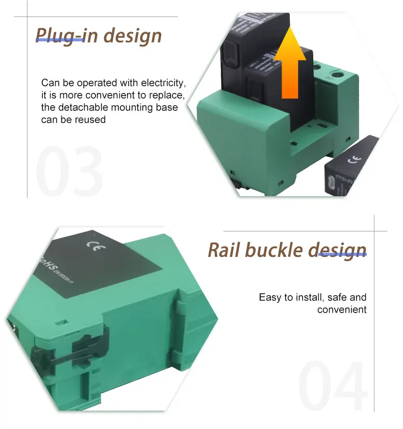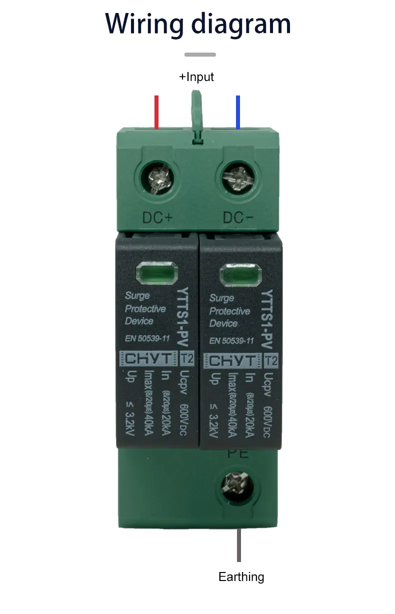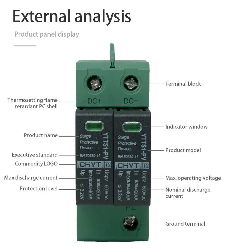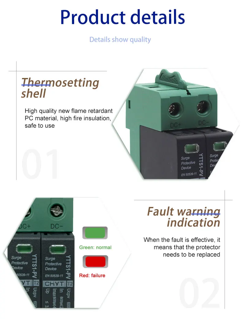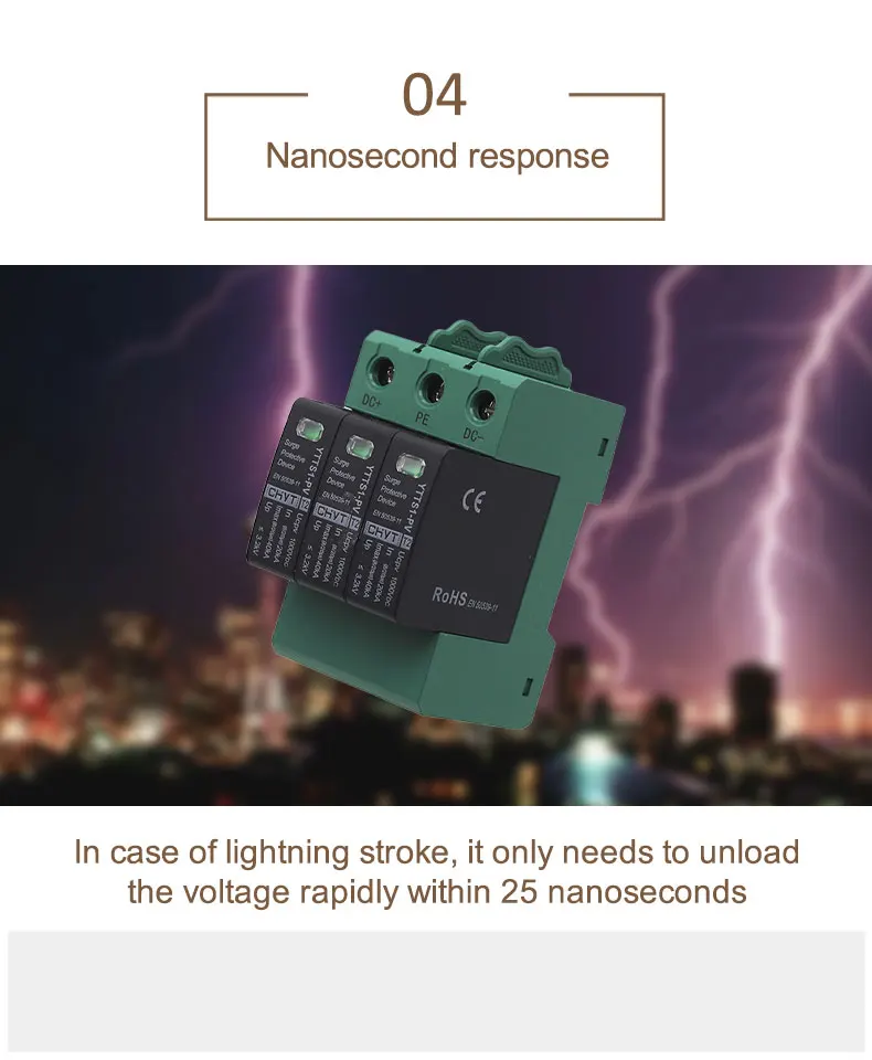 Устройство защиты от перенапряжения, защита от перенапряжения молнии в Солнечной системе (фотоэлектрическая система питания). Эти устройства должны быть установлены параллельно сетям постоянного тока для защиты и обеспечения общей и различной защиты режимов. Его установленное расположение рекомендуется на обоих концах линии питания постоянного тока (сторона солнечной панели и сторона инвертора/преобразователя), особенно если линия маршрутизации внешняя и длинная. Высокая энергия MOVs оснащен специфическими тепловыми разъемами и соответствующими индикаторами неисправности.