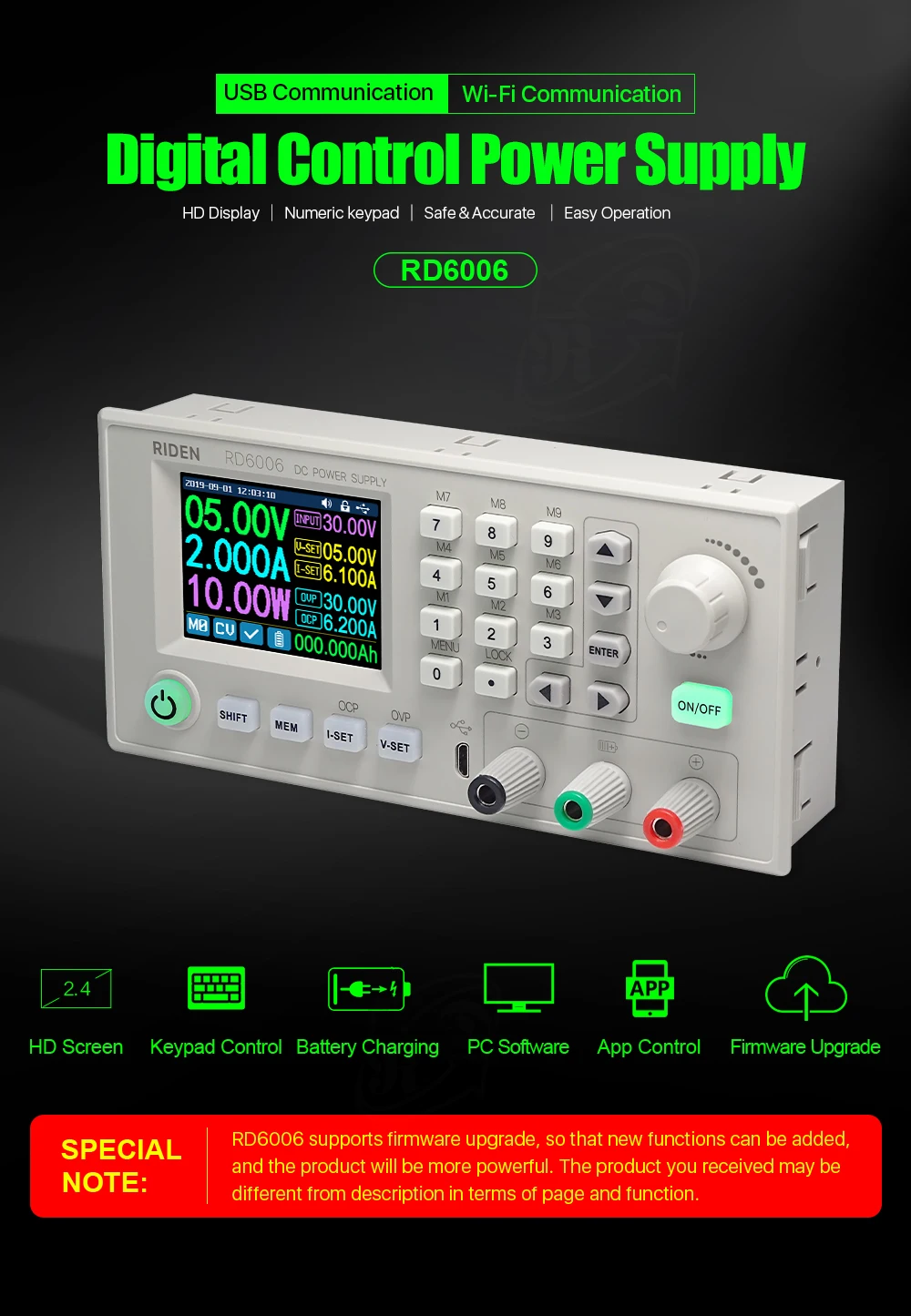 1, RD6006 имеет две версии:RD6006ИRD6006-W, У RD6006-W естьWI-FIПлата, RD6006 нет. RD6006-W может использовать Wi-Fi плату для подключения приложения и программного обеспечения, а также использовать микро-кабель USB для подключения ПК solftware. RD6006 не имеет Wi-Fi платы, только поддержка программного обеспечения ПК путем подключения с USB микро кабель, без поддержки приложения.