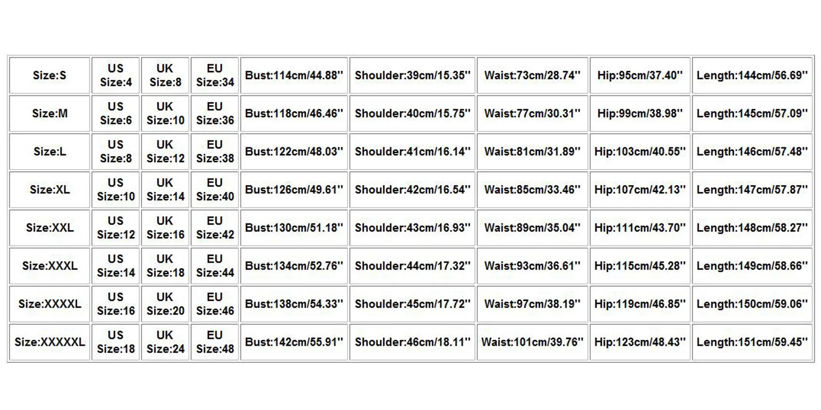 Размеры Американский размер Размер Великобритании Европейский размер Бюст Плечо Талия Бедра Длина S 4. 8 34 114 см/44,88'' 39 см/15,35'' 73 см/28,74'' 95 см/37,40'' 144 см/56,69'' М 6 10 36 118 см/46,46'' 40 см/15,75'' 77 см/30,31'' 99 см/38,98'' 145 см/57,09'' L 8 12 38 122 см/48,03'' 41 см/16,14'' 81 см/31,89'' 103 см/40,55'' 146 см/57,48'' XL 10 14 40 126 см/49,61'' 42 см/16,54'' 85 см/33,46'' 107 см/42,13'' 147 см/57,87'' XXL 12 16 42 130 см/51,18'' 43 см/16,93'' 89 см/35,04'' 111 см/43,70'' 148 см/58,27'' XХХL 14 18 44 134 см/52,76'' 44 см/17,32'' 93 см/36,61'' 115 см/45,28'' 149 см/58,66'' XXXXL 16 20 46 138 см/54,33'' 45 см/17,72'' 97 см/38,19'' 119 см/46,85'' 150 см/59,06'' XXXXXL 18 24 48 142 см/55,91'' 46 см/18,11'' 101 см/39,76'' 123 см/48,43'' 151 см/59,45''