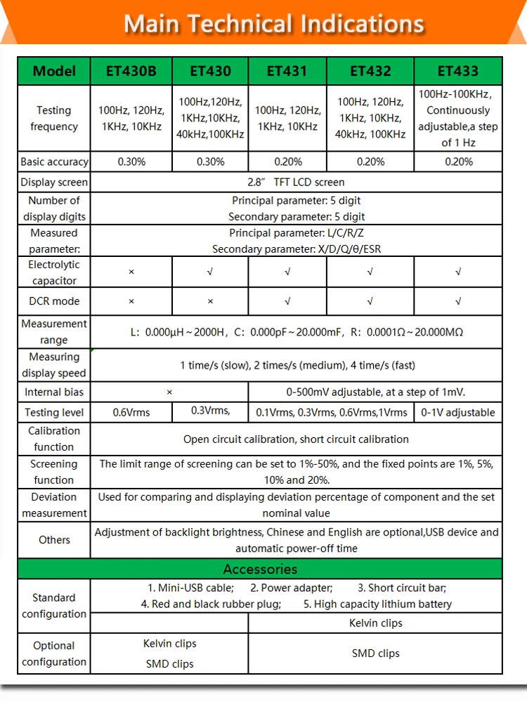 ET43 серии ручной мост особенности 2,8 "экраном тонкопленочной технологии (тпт), легкое управление кнопкой и usb-связь. Его литиевая батарея высокой емкости обеспечивает долгий срок службы. Он может измерять комплексные параметры и поддерживает для проверки и измерения отклонений, с непрерывно регулируемой выходной частотой. Основная точность достигает 0.2%/0.3%.