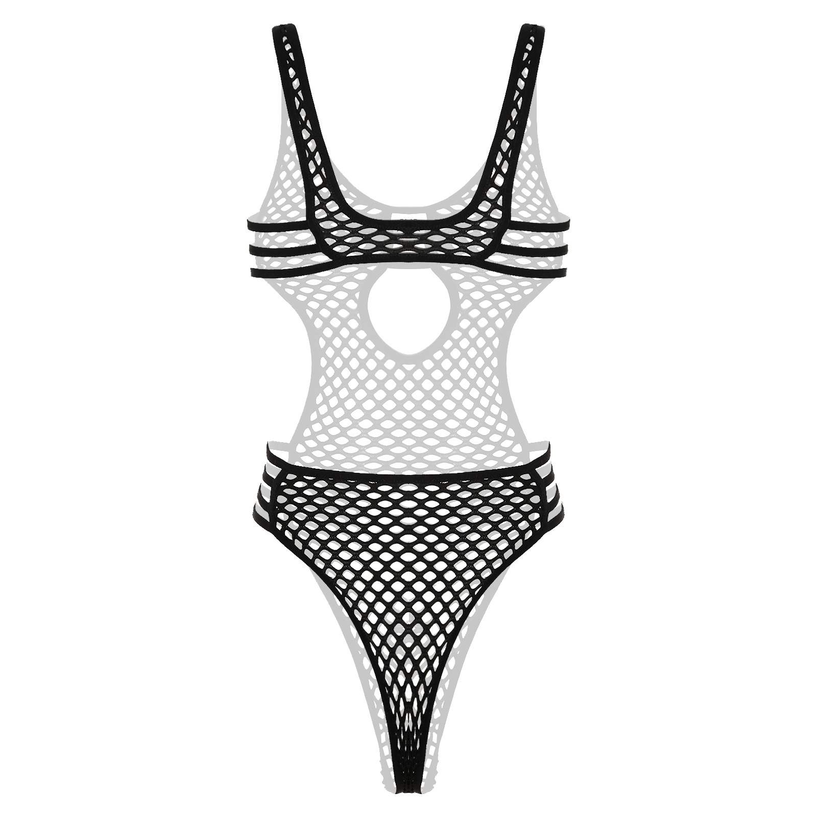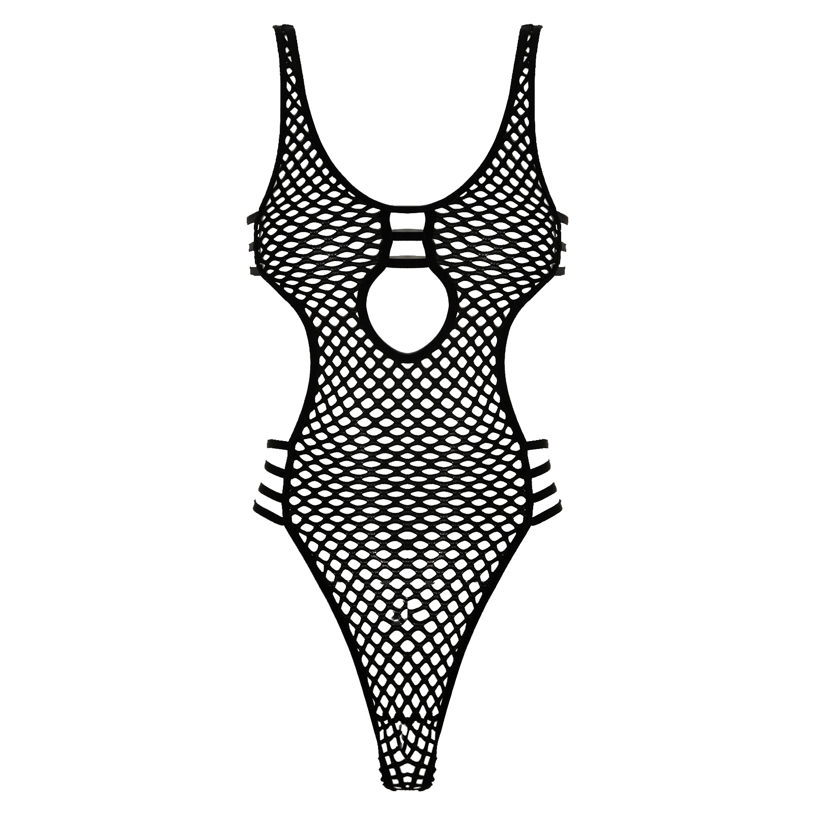 Женское прозрачное боди с вырезами и глубоким вырезом в сетку.