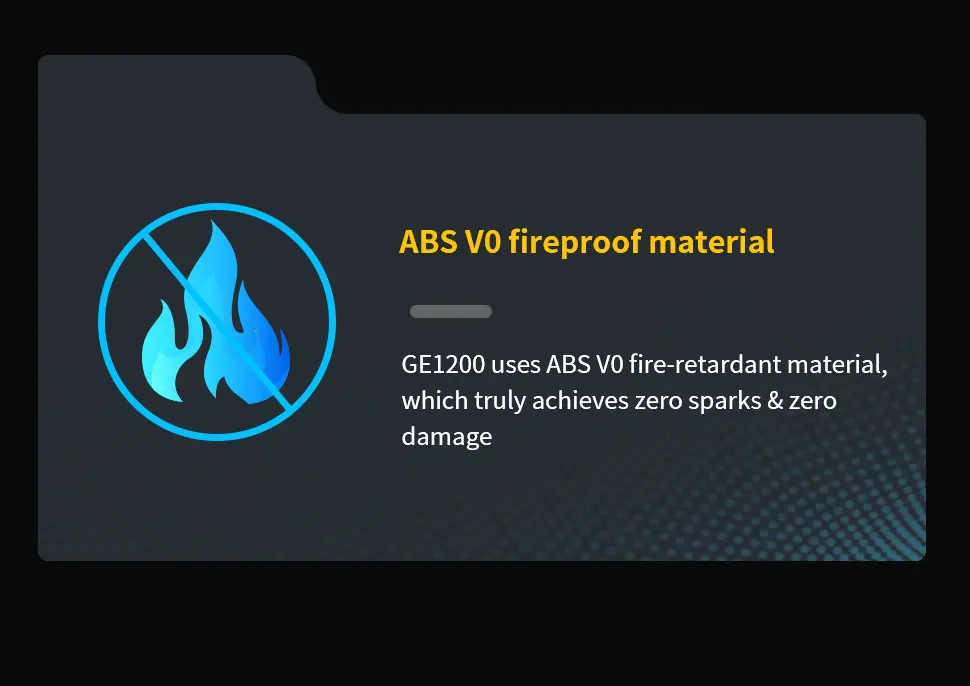 GE1200 использует огнестойкий материал ABS V0, который действительно достигает нулевой искры и нулевого повреждения.